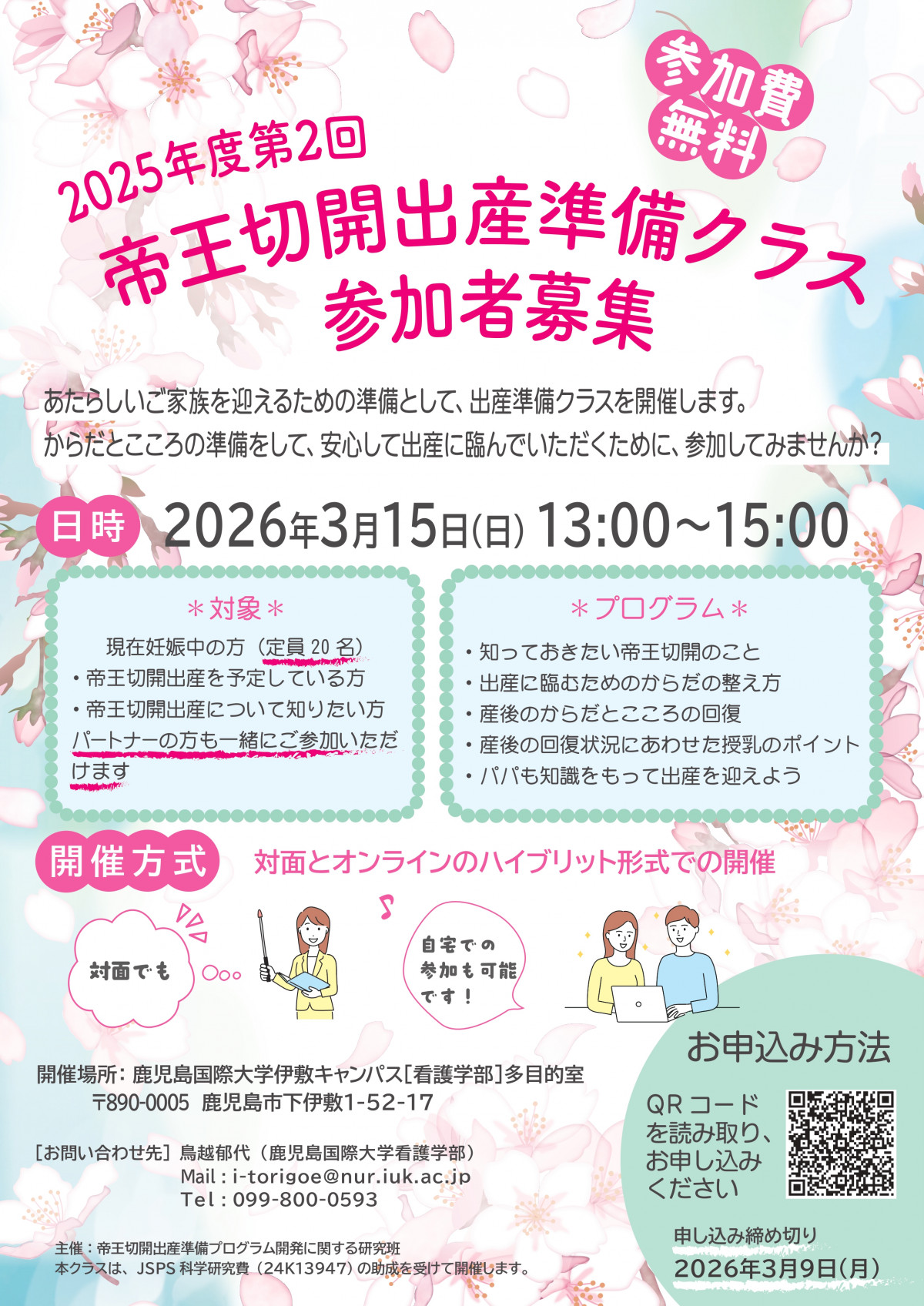 - 対 象:現在妊娠中の方で、帝王切開出産を予定している方、帝王切開出産について知りたい方(定員20名)※パートナーの方も一緒にご参加いただけます