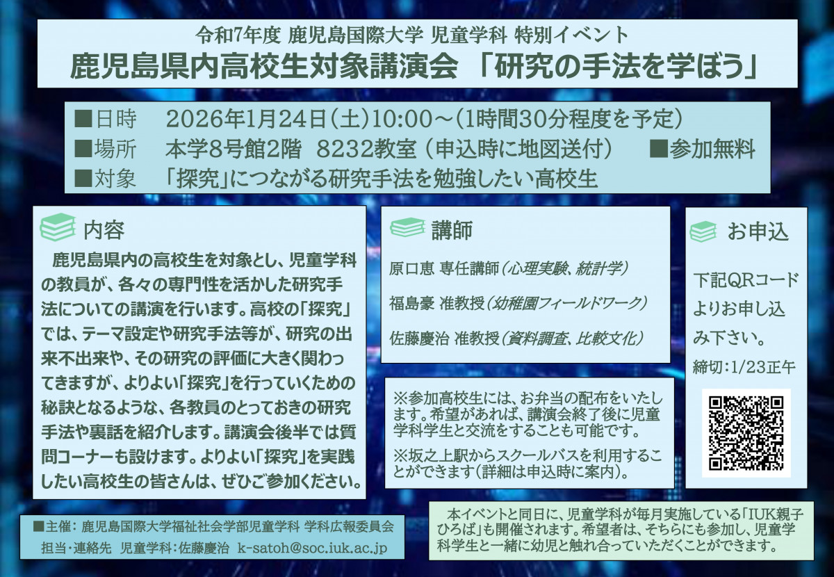 鹿児島県内の高校生を対象とし、児童学科の教員が、各々の専門性を活かした研究手法についての講演を行います。高校の「探究」では、テーマ設定や研究手法等が、研究の出来不出来や、その研究の評価に大きく関わってきますが、よりよい「探究」を行っていくための秘訣となるような、各教員のとっておきの研究手法や裏話を紹介します。講演会後半では質問コーナーも設けます。よりよい「探究」を実践したい高校生の皆さんは、ぜひご参加ください。