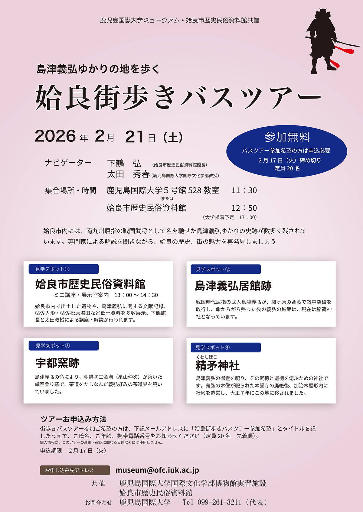 - 集合場所・時間:鹿児島国際大学5号館528教室 11:30 または姶良市歴史民俗資料館 12:50