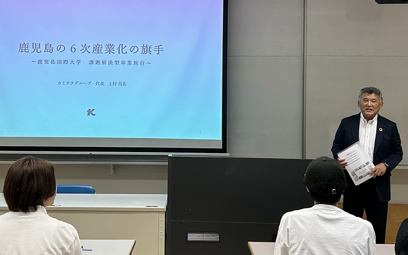 「課題解決型卒業旅行」は、中西ゼミが鹿児島県を代表する6次産業企業、(株)カミチクホールディングスのご協力により毎年行っている卒業課題で、中西孝平教授より提示された課題を踏まえ、同社の農業関連施設を見学し、課題解決の方策を考える取り組みです。