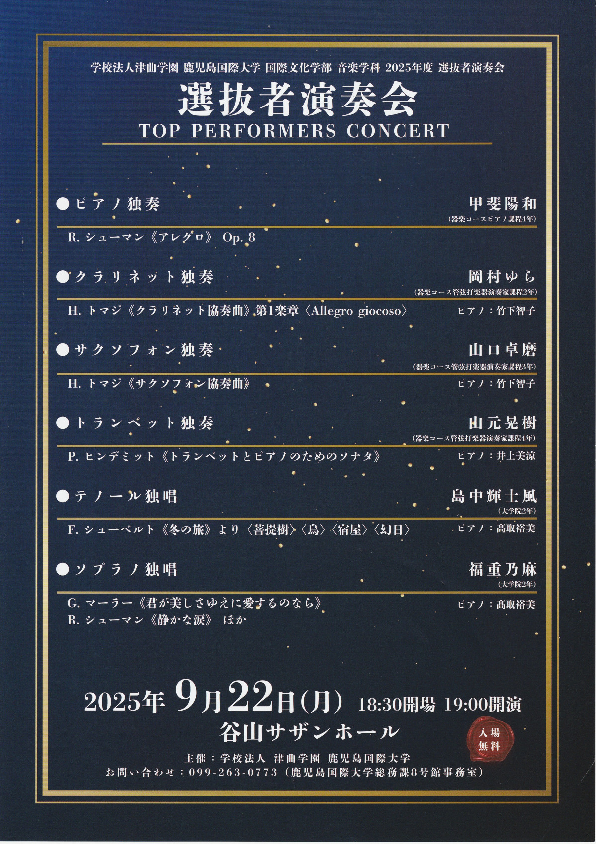 「音楽学科 2025年度 選抜者演奏会」が9月22日、谷山サザンホールで開催されました。この演奏会は、24年度の各種コンクールで優秀な成績を収めた者や、本学「インターナショナル・ミュージック・プロジェクト」で海外へ派遣された者が出演するもので、甲斐陽和(ピアノ/4年)、岡村ゆら(クラリネット/2年)、山口卓磨(サクソフォン/3年)、山元晃樹(トランペット/4年)、島中輝士風(テノール/大学院2年)、福重乃麻(ソプラノ/大学院2年)の6名が研鑽の成果を披露しました。