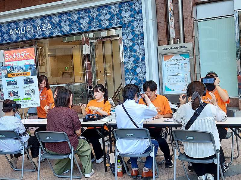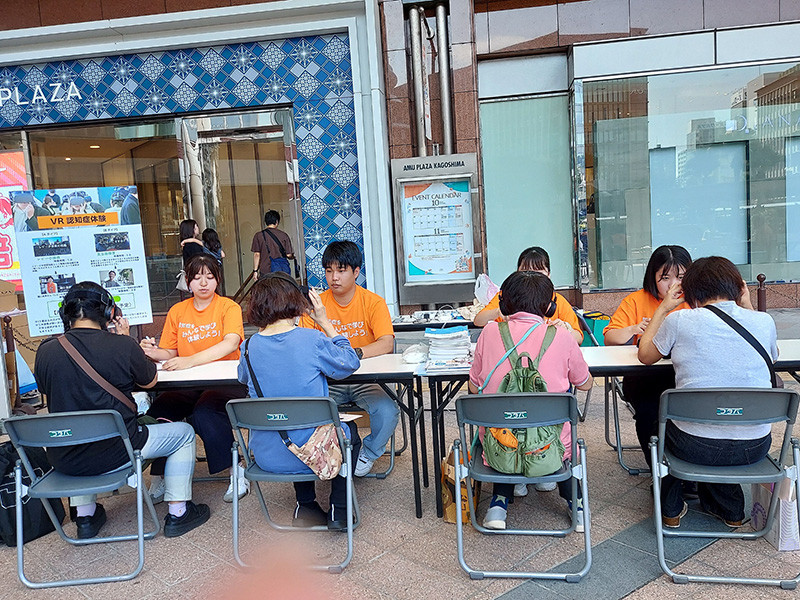 このイベントは、認知症に対する偏見をなくし、誰もが安心して暮らせる地域社会を目指すことを目的としたイベントで、ステージや体験・認知症関連作品展示ブースなど、認知症について楽しく学べる盛りだくさんの企画が用意されました。ゼミ生たちは、認知症の症状を疑似体験できる「VR(仮想現実)認知症体験」のブースを担当させていただきました。
