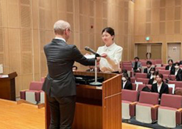 12月9日に令和7年度特待生・特別奨学生(学部留学生)表彰式が視聴覚ホールで行われ、特待生26名(看護学部2名の学生については12月16日に表彰式実施)、特別奨学生9名、特別奨学生(学部留学生)1名及び関係者が出席し、小林学長から代表者へ表彰状が授与されました。
