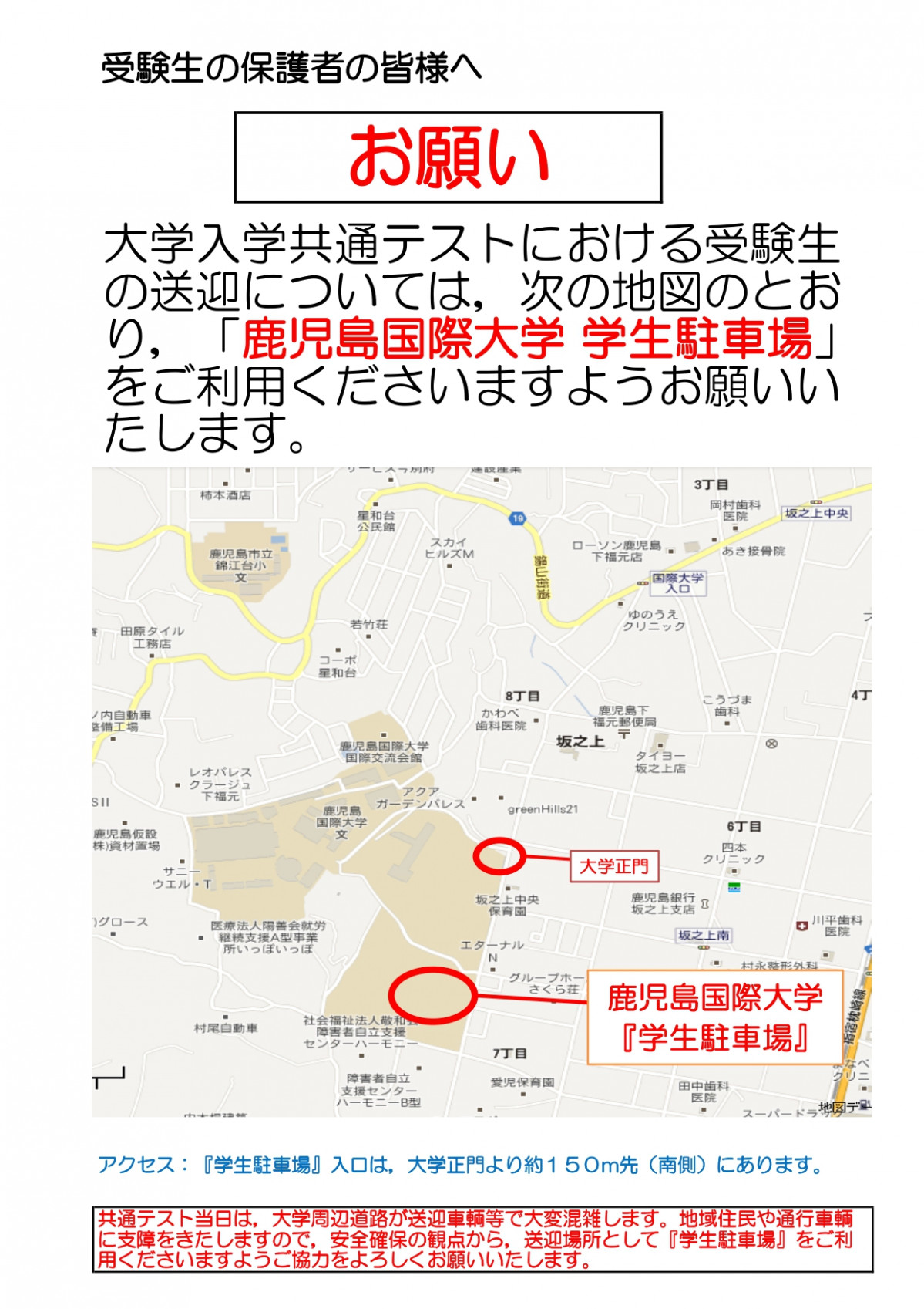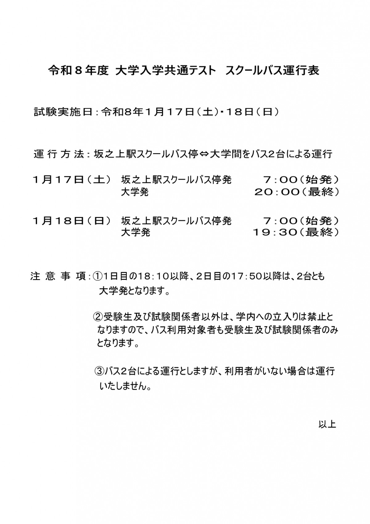 試験当日はJR坂之上駅スクールバス乗り場(JR坂之上駅改札口を左=指宿方面=に出て線路沿いに約200m)と大学間でスクールバスを運行(無料)します。