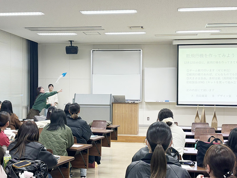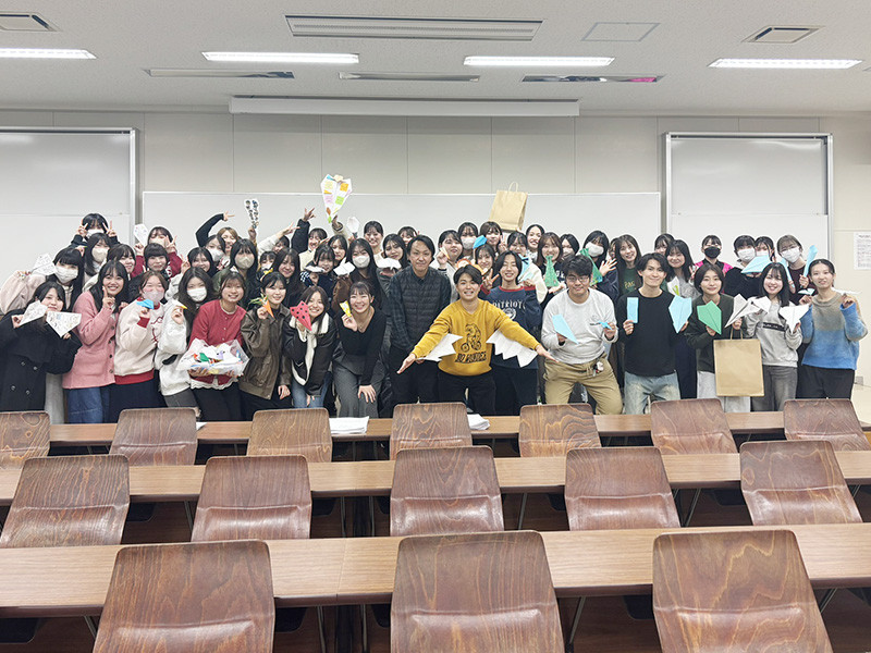 学生からは「保育をしていくうえで子どもたちだけでなく、保育をする側も楽しむことが大切であることが分かった。まずは私たちが楽しむことを忘れないようにしたい。」などの感想が聞かれました。紙飛行機大会を通して福冨先生が教えてくださったのは、一生懸命遊ぶことの喜びと素晴らしさでした。