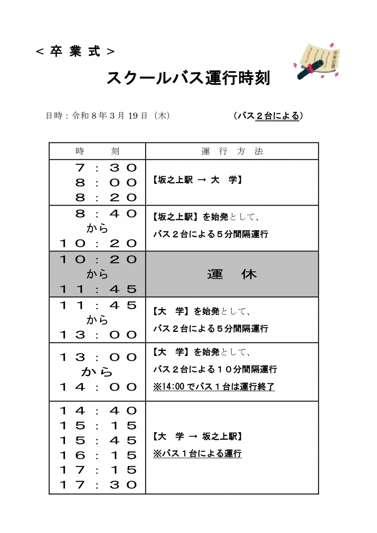 (5)当日は、坂之上周辺の交通渋滞が予想されますので、なるべくJR等の公共交通機関をご利用いただきますようお願いいたします。また、JR坂之上駅~本学間のスクールバスを運行しますので、ご利用ください。