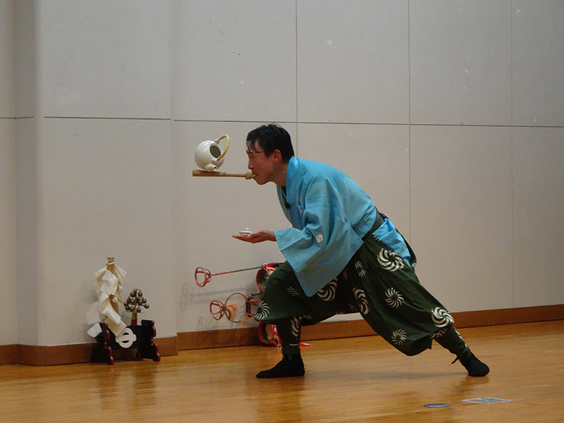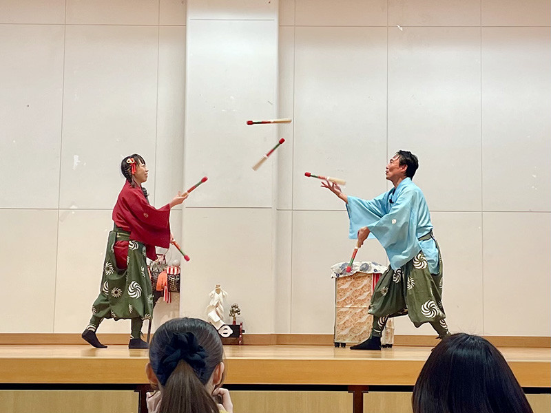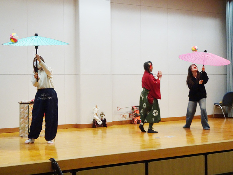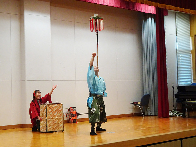 音楽学科特別公開講座「江戸太神楽 仙若・花仙のお二人をお招きして」が12月22日(月)、8号館1階プレイルームで開催されました。講師を務めた丸一仙若・花仙のお二人は江戸太神楽「丸一仙翁社中」(東京都指定無形民俗文化財)所属。東京を拠点として各地での公演のほか、テレビ、映画、舞台、ドラマなどにも多数出演し、教育現場や自治体、企業、福祉施設での芸術文化鑑賞教室も積極的に行っています。講座では寿獅子舞、傘の曲、撥の曲、一つ毬の曲、五階茶碗の曲など至芸の数々を披露され、会場内は感動と感嘆の渦に包まれました。また、学生による体験コーナーも設けてくださり、受講生たちは積極果敢に奮闘していました。