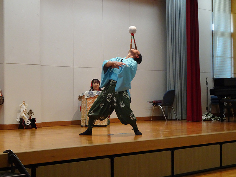 筋の良さを誉められた元脇葵さん(ユーフォニアム3年)は「寿獅子舞と投げ物、花籠鞠、五階茶碗、傘回し等たくさんの曲芸を披露していただき、映像で見る以上の緊張感と迫力にとても感動した。また、分かりやすいように説明を交えながら実演してくださったことで、より一層理解が深まった。拝見できる機会が少ないにもかかわらず、実際に体験までさせていただき、非常に貴重で楽しく、学びのある時間だった」と感激していました。