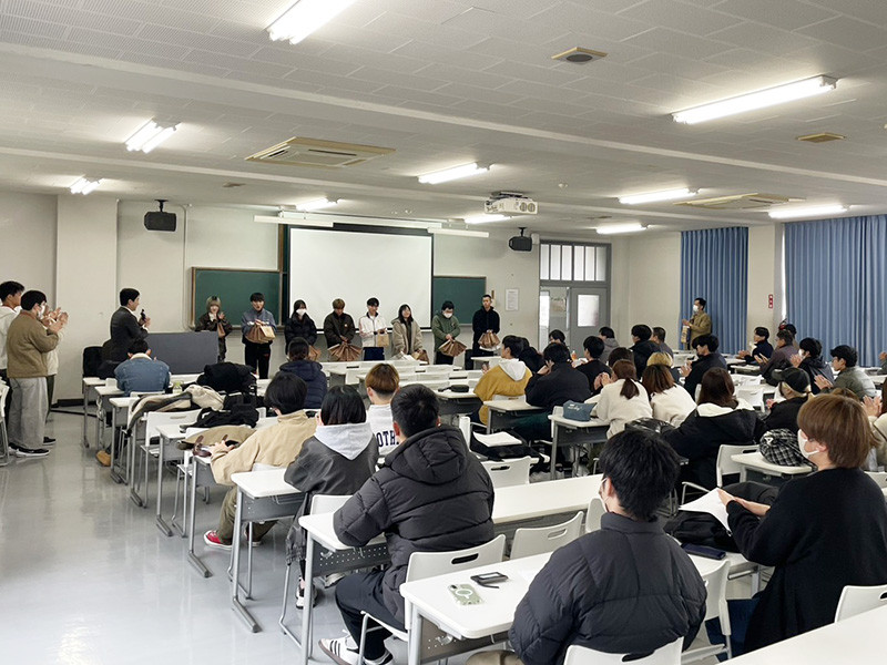 1月22日(木)、経済学科「新入生ゼミナールⅡ」の最終日にプレゼンテーション大会が開催されました。この大会に向けて1年生は各組内でグループに分かれ、自分たちの興味のあるテーマや地域の課題について調査・研究を重ねてきました。当日は、各組の代表グループが1年生全員の前で発表を行い、聴講した1年生・スチューデントアシスタント・教員による投票の結果、次の上位3グループを表彰しました。