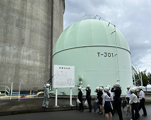「企業形態論」は、学生たちに鹿児島の主要産業であるエネルギー産業に対する関心を抱いてもらうことを目的として、地元エネルギー関連企業4社の協力により実施されています。この就業体験では、4社の業務について深く知ることができる施設等の見学や若手社員との座談会が用意されました。学生たちは、6月に本科目で実施された4社との共同授業で得た知識を踏まえ、4社をしっかり観察している様子で、座談会においても、現在の職場を選んだ理由や社会人になってからの生活等、自身のキャリアを考えるうえで意義のある質問をたくさんしていました。