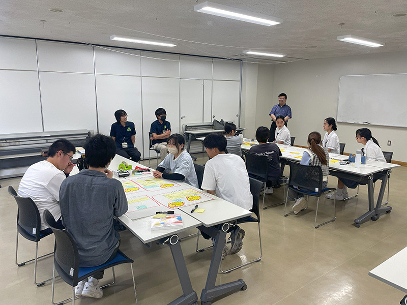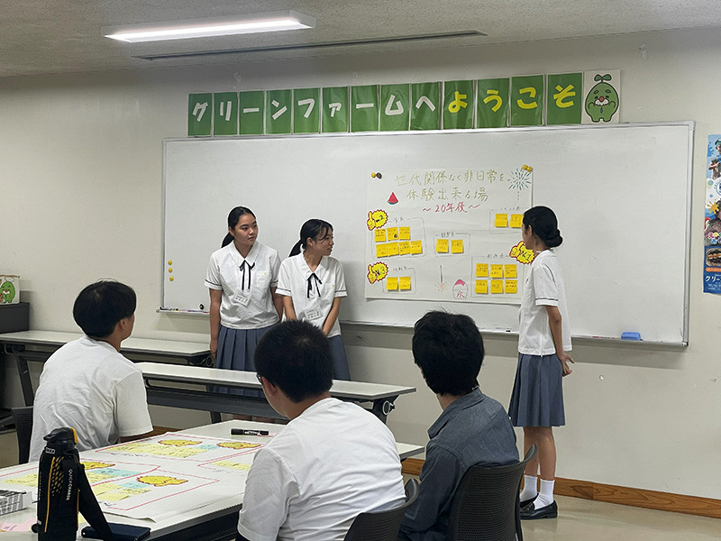今回は、太田ゼミが鹿児島市との協定のもとで連携活動を行っている鹿児島市観光農業公園グリーンファームでフィールドワークを実施。自分たちで収穫した新鮮な野菜を使った調理体験を通じて参加者同士の交流を深め、ワークショップでは、近未来の農業公園における施設の在り方について考える活動が行われ、高校生から新しい発想や意見が寄せられました。