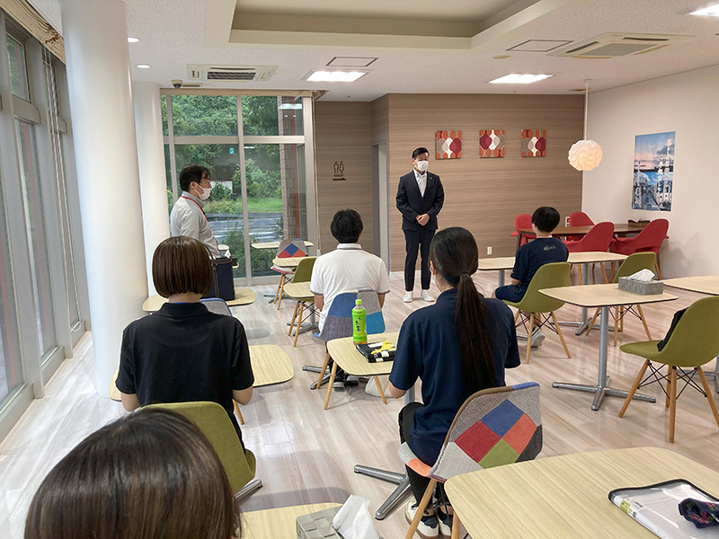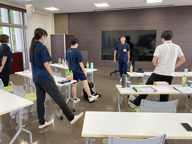 当日は、「スポーツと福祉のまちづくり」と題し、ニコニコタウンきいれのご協力をいただき、様々なプログラムを体験しました。はじめに、デイケアリハビリテーションにて、入居高齢者が日頃から使用しているスポーツジムやコグニサイズを体験し、スポーツを取り入れた福祉サービスについて体感しました。その後、同法人理事長の新田氏の講話があり、鹿児島ユナイテッドFCとの地域活性化への取り組みや喜入に人を集約するスポーツ企画づくりの工夫などを学ぶことができました。最後に、スポーツを通した地域づくりについて意見交換を行いました。