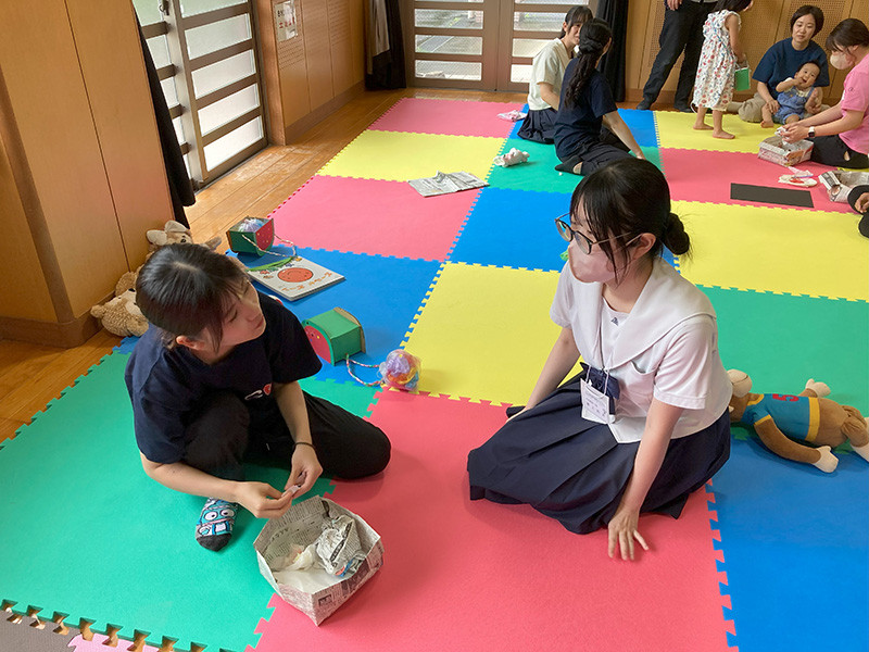 本学学生が主体となって、こどもの年齢や成長過程の運動能力などを考えた保育活動を準備していることに、高校生も驚きとすごさを感じている様子でした。