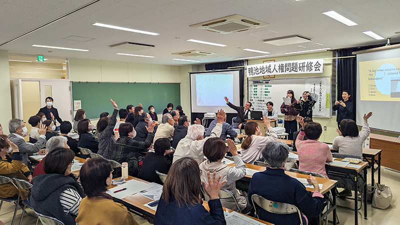 国際文化学科のマクマレイゼミ生23名は11月13日に、鴨池公民館にて開催された人権問題研修会にゲストスピーカーとして参加し、マクマレイ教授が「日本人と西洋人における写真俳句の捉え方の違い」をテーマに講演を行いました。ゼミ生は地域素材を用いた「俳句クイズ」を実施し、多くの地域住民の皆さまにご参加いただきました。クイズは大いに盛り上がり、俳句という文化資源が持つ国際性や、観光資源としての可能性を改めて実感する機会となりました。ここで実際に桜島を題材として詩と俳句は以下のものがあります。一見すると異なる題材を扱っていますが、どちらにも共通して鹿児島という土地の記憶 とも深く結びつけている点や、桜島は鹿児島にとって噴火・戦争・自然との共生といった歴史を背負い、厳しくも力強い土地の姿を表現するものとして位置づけられていることが理解できます。