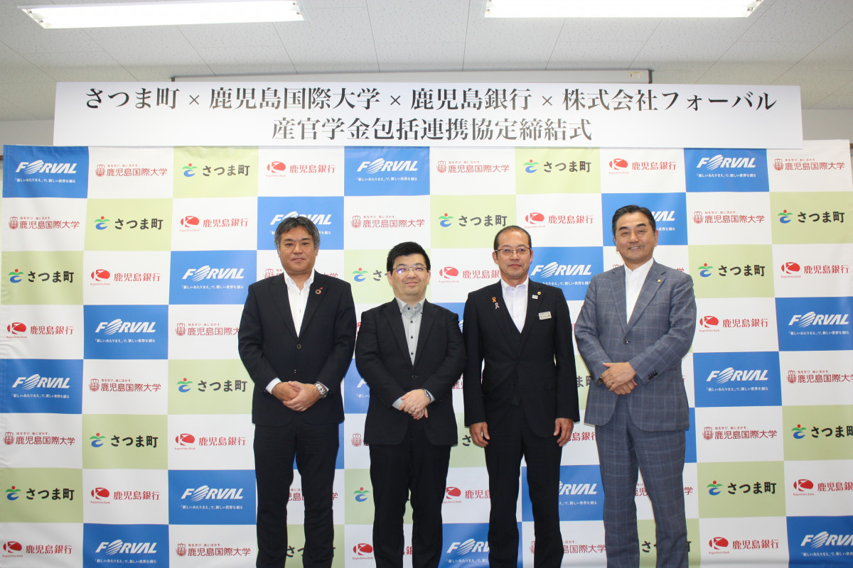 さつま町(上野俊市町長)と10月に包括連携協定を締結した本学は12月11日、鹿児島銀行(郡山明久頭取)と株式会社フォーバル(中島將典代表取締役)を加えた四者間で「産官学金包括連携協定」を締結しました。
