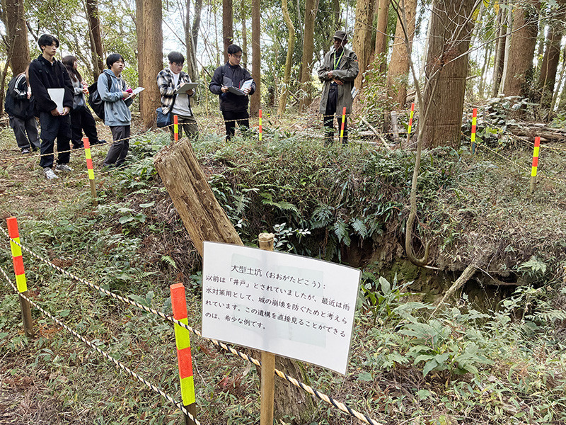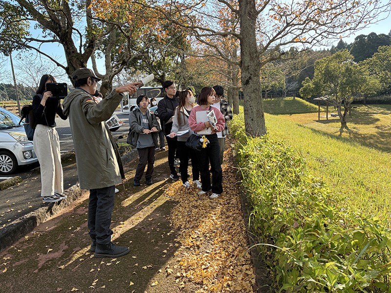 南九州市文化財課の新地浩一郎氏の案内のもと、勝目小学校跡地の石敢當、中山田のオキチモズク生息地、旧勝目郵便局、椎原病院、勝目城跡、竹屋神社、水神(用水路)、塘之池公園(答石遺跡)などを訪れました。各地点では概要に加え、現状や課題について丁寧に説明していただき、学生たちは興味深く耳を傾けながらメモを取ったり写真を撮ったりしました。