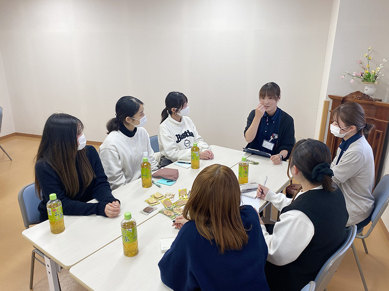 対応してくださったのは、本学社会福祉学科の卒業生であり、日々の業務内容に加え、社会人としての生活やワークライフバランスについて、具体的な話を伺うことができました。