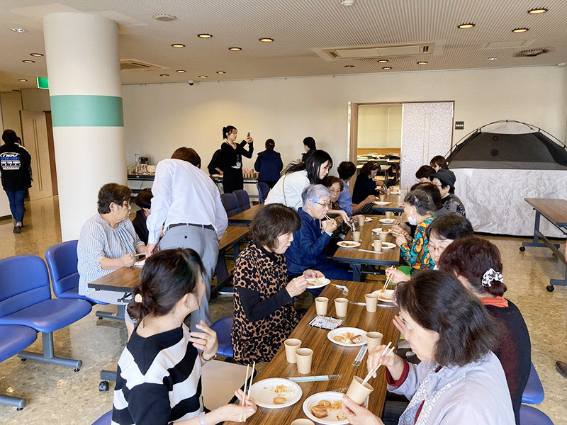 また、非常食の試食、段ボールベッドや防災グッズなど避難所体験にて、日頃の備えの重要性について認識を深め、講話を通して災害時の備えや地域コミュニティの形成について学びました。