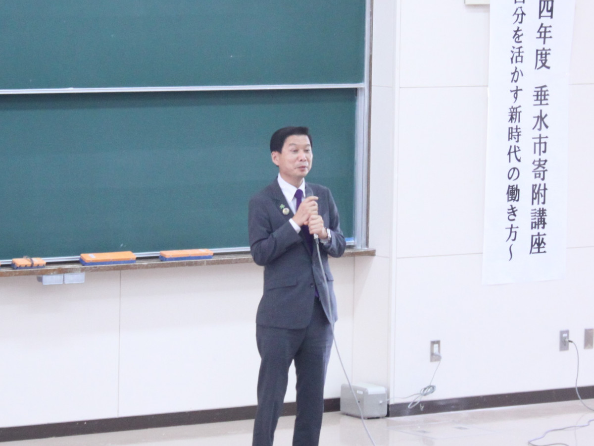 引き続き行われた垂水市寄附講座の閉講式では、尾脇雅弥垂水市長が「皆さんの人生には多くの可能性がある。その可能性をしっかりと手元に寄せて大きく花開くためにも、大きな目標をもって頑張ってもらいたい」と学生にメッセージを送りました。